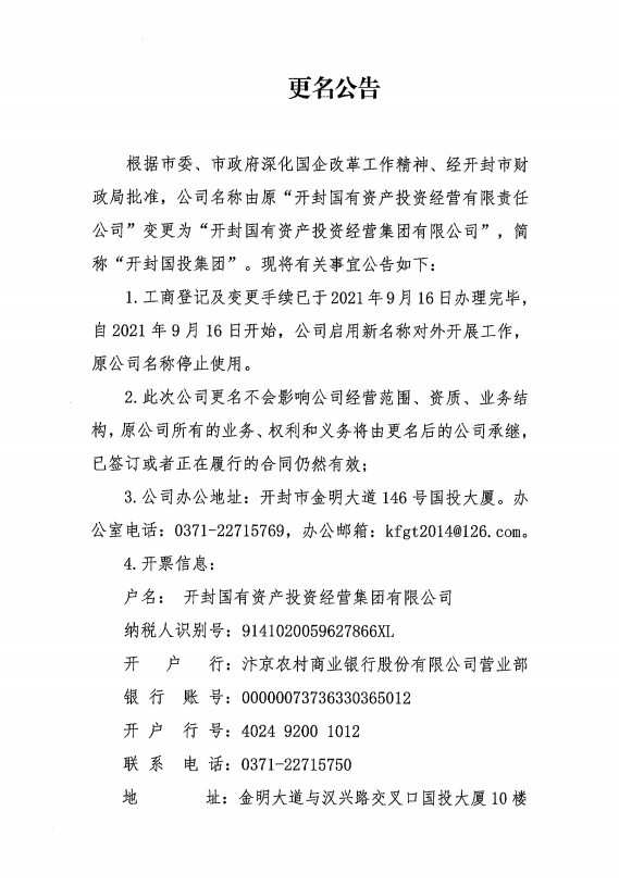 根據(jù)市委、市政府深化國(guó)企改革工作精神、經(jīng)開(kāi)封市財(cái)政局批準(zhǔn),公司名稱由原“開(kāi)封國(guó)有資產(chǎn)投資經(jīng)營(yíng)有限責(zé)任公司”變更為“開(kāi)封國(guó)有資產(chǎn)投資經(jīng)營(yíng)集團(tuán)有限公司”,...